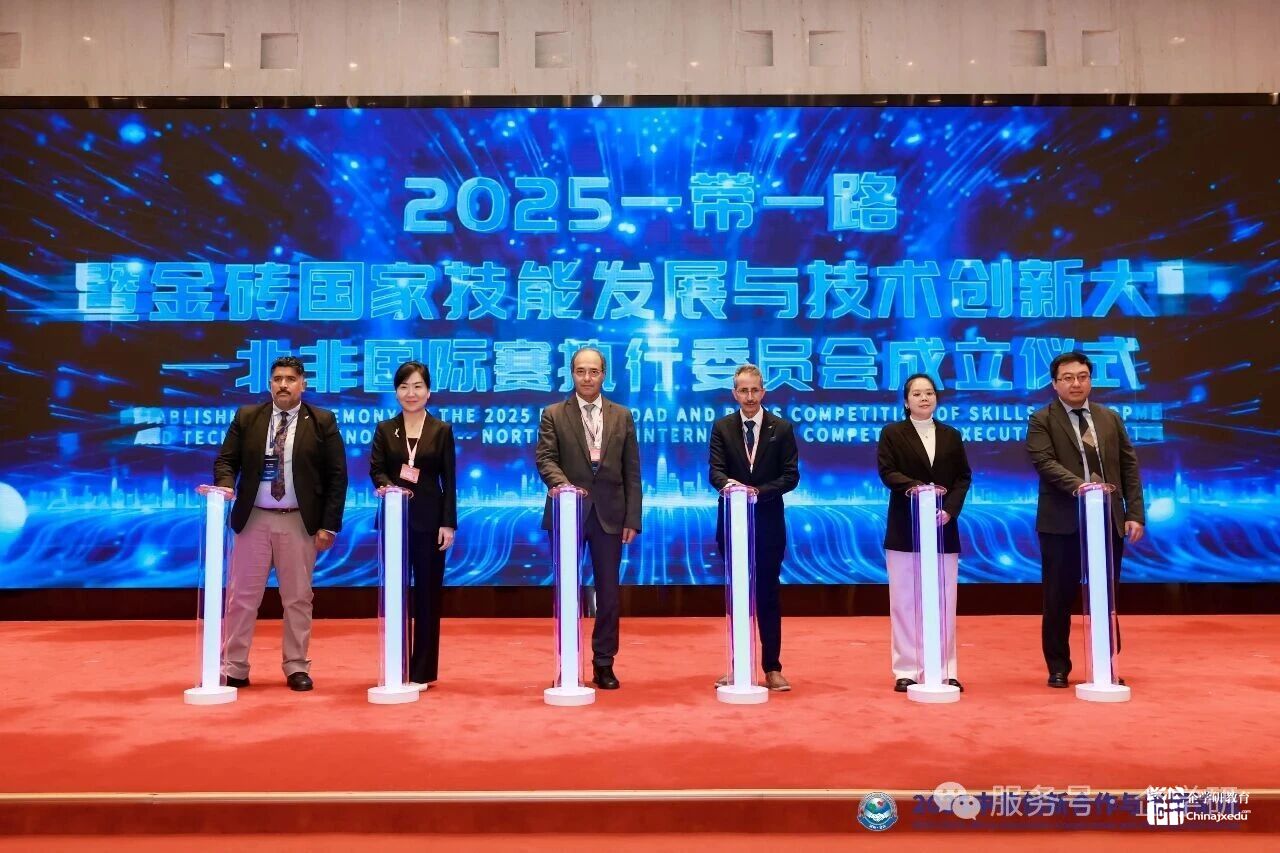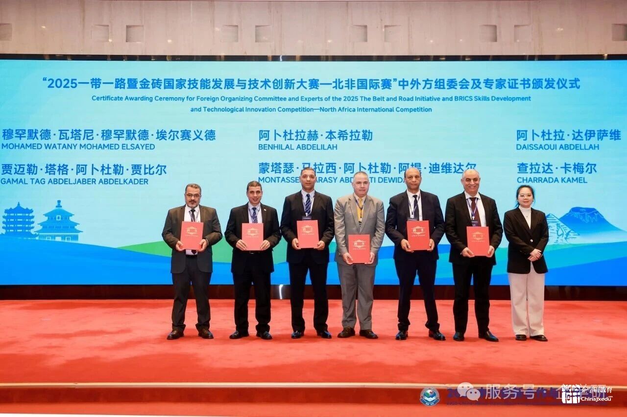 2025年11月22日,“2025一带一路暨金砖国家技能发展与技术创新大赛—北非国际赛执行委员会成立仪式”和“中外方组委会暨专家证书颁发仪式”在武汉中非教育合作创新发展论坛上举行。中北非国际教育创新联盟副主席巴尔卡维、摩洛哥中北非国际教育创新联盟副主席马祖兹、突尼斯中北非国际教育创新联盟副主席凯斯、中北非国际教育创新联盟秘书长陈璐、厦门市金砖未来技能发展与技术创新研究院的国际部部长朱秀青、北京企学研教育科技研究院副院长李昂共同参加“2025一带一路暨金砖国家技能发展与技术创新大赛—北非国际赛执行委员会成立仪式”。