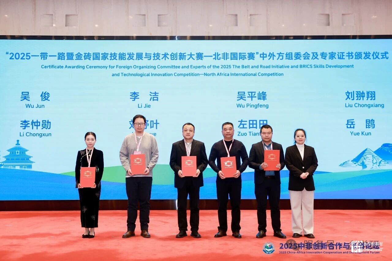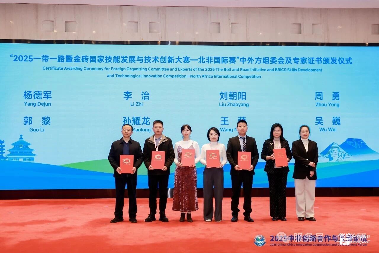 “2025一带一路暨金砖国家技能发展与技术创新大赛”是中北非国际职业教育数字化创新技能竞赛首次被纳入金砖大赛中的重要赛事。会上厦门市金砖未来技能发展与技术创新研究院的国际部部长朱秀青北非国际赛部分专家颁发专家证书。