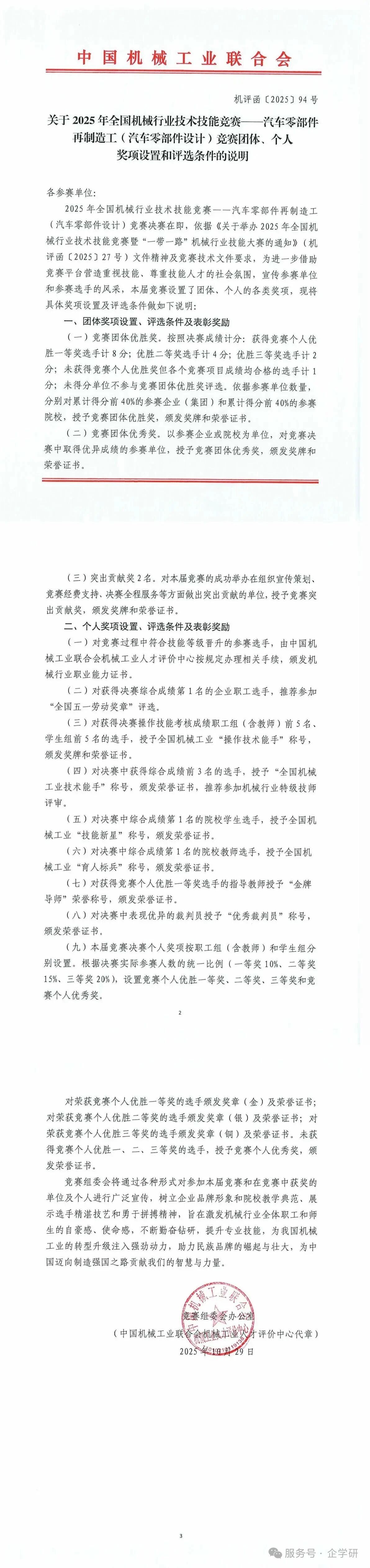 2025 年汽车零部件再制造工(汽车零部件设计)竞赛团体、个人奖项设置和评选条件的说明