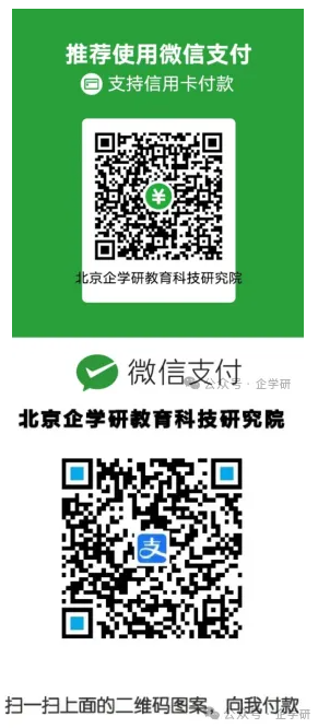 (2)培训费由北京企学研教育科技研究院统一收取并开具增值税普通发票。培训费支付方式分为扫描收款码支付、对公转账支付两种方式。