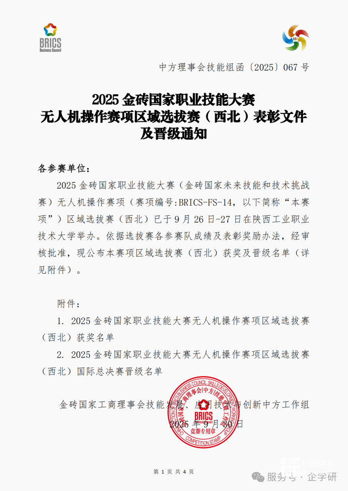 2025金砖国家职业技能大赛无人机操作赛项区域选拔赛(西北)表彰文件及晋级通知