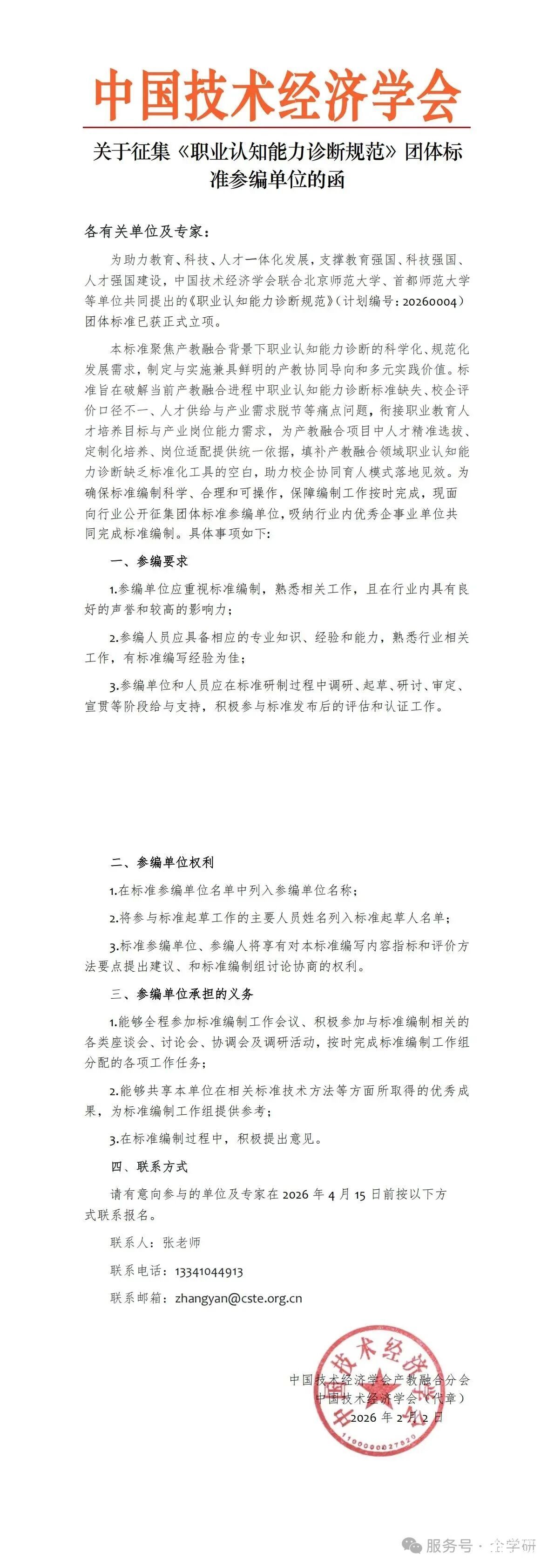 关于征集《职业认知能力诊断规范》团体标准参编单位的函