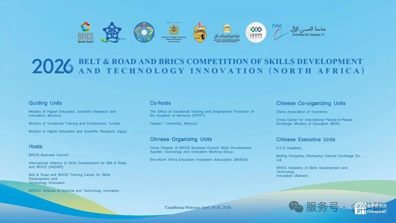 2026一带一路暨金砖大赛北非国际赛决赛将于2026年4月19日至26日在摩洛哥卡萨布兰卡举行。赛事举办将为中国与北非国家在技能发展和技术创新领域的合作搭建人才培养与竞赛交流平台,服务国内外高校参与国际赛事和促进技术技能提升。