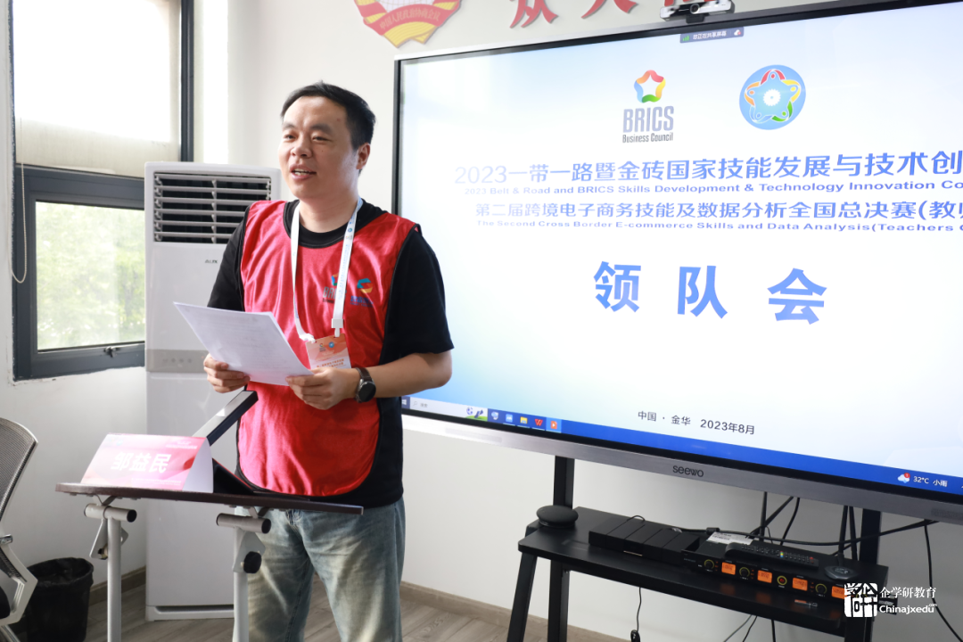 领队会由周海燕老师主持。首先由本赛项仲裁长、清华大学基础工业训练中心顾问付宏生教授介绍比赛整体技术要求,随后,赛项裁判员陈海城代表全体裁判员宣誓,教师组选手代表黄均勇老师代表全体选手宣誓。由专家组长、浙江师范大学电子商务研究与发展中心主任邹益民博士对比赛安排进行讲解,赛项裁判长、浙江工商大学电子商务系主任蒋长兵老师宣读比赛注意事项并答疑。最后,裁判长组织教师组参赛选手进行赛场和赛位的抽签。